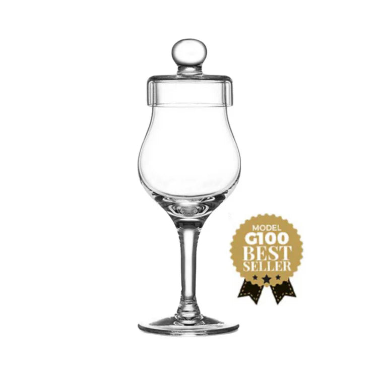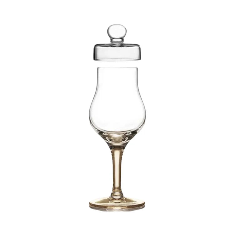 Unit price perA tulip-shaped, handcrafted glass, slightly modified by our experts. Recommended for heavier peat-smoke whiskies. The tapered mouth nicely concentrates aromas ensuring maximum tasting and nosing satisfaction. Its delicate shape comes from a meticulous glass blowing process. The high, slender stem emphasizes the shape of the bowl. Supplied with a handcrafted matching “outside” cover which prevents evaporation and preserves the aroma. A perfect set for all “water of life” aficionados. Comes with a lid.