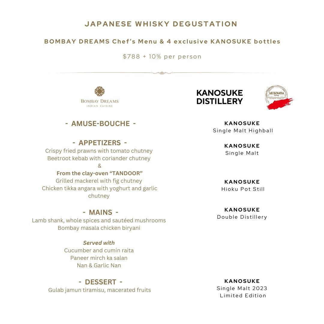 歡迎參加我們在 Bombay Dreams 舉辦的獨家晚宴,您將有機會品嚐 Kanosuke 威士忌的風味,並在 Kanosuke 威士忌大使 Shunsuke Yoshikawa 先生和 Yukio Oiwa 先生的指導下品嚐。